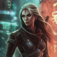 an urban environment with neon lights, which could indicate that the setting takes place in a cyberpunk or dystopian cityscape.