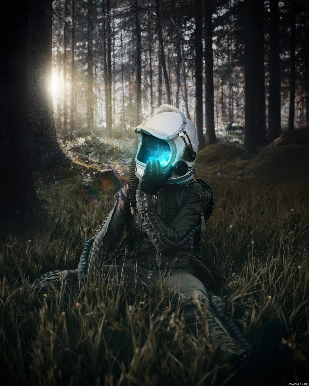 The image depicts an astronaut sitting in a forest with tall,