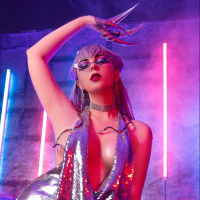 neon lights and what seems to be a sign in Chinese, adding to the vibrant and energetic atmosphere consistent with cosplay events or performances.