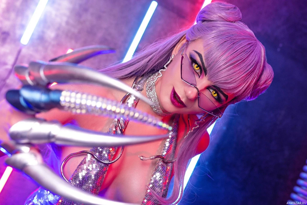 League of Legends," specifically resembling characters like Akali or Evelynn, who are known for their distinctive styles and combat abilities within the game's universe. The setting appears to be a stage or event, as indicated by