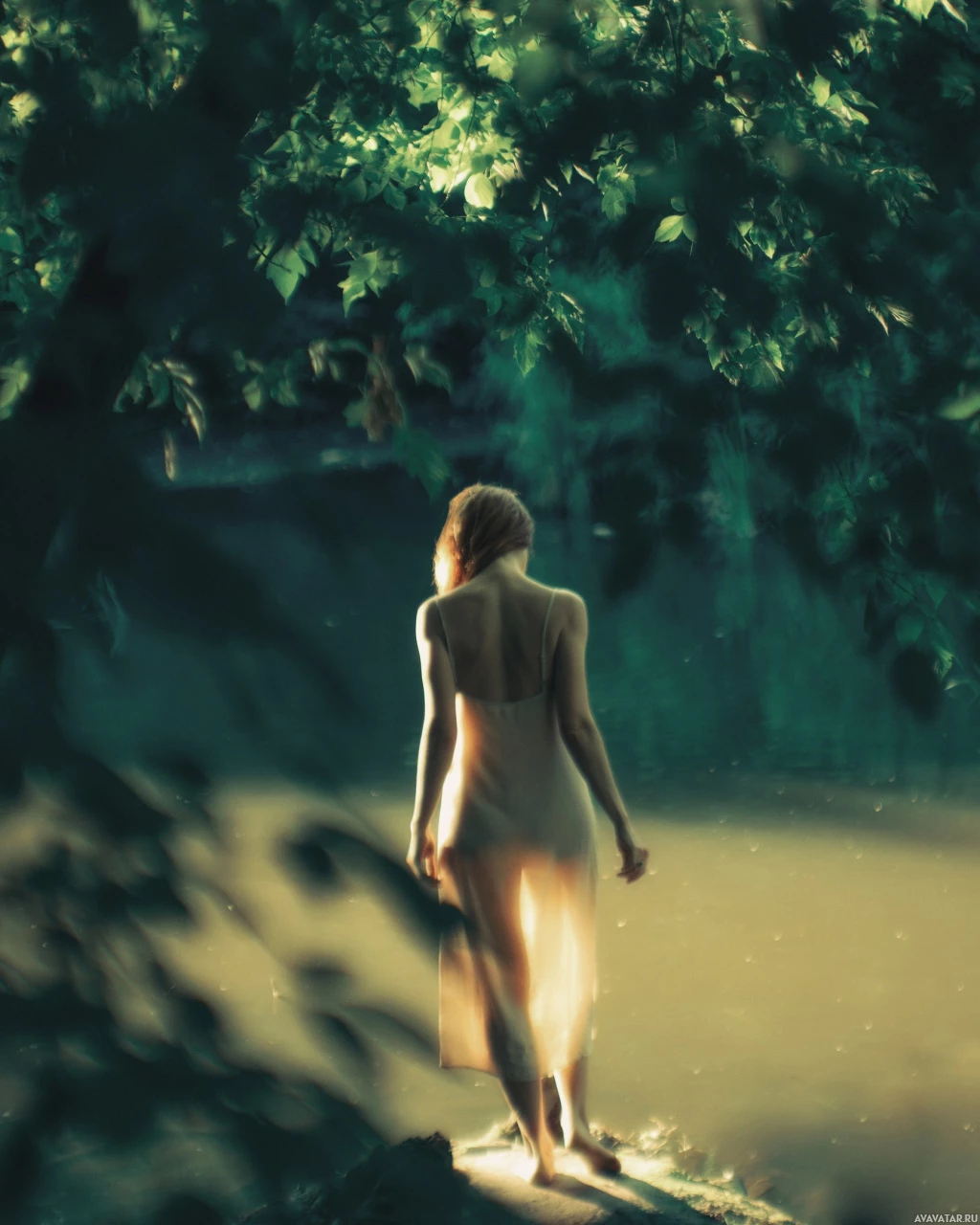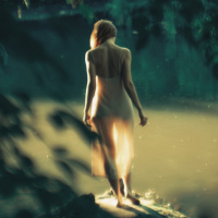 a natural setting. She appears to be looking at something or someone behind her, as her gaze is directed away from the viewer. The scene is set in a forest with lush greenery and what looks like