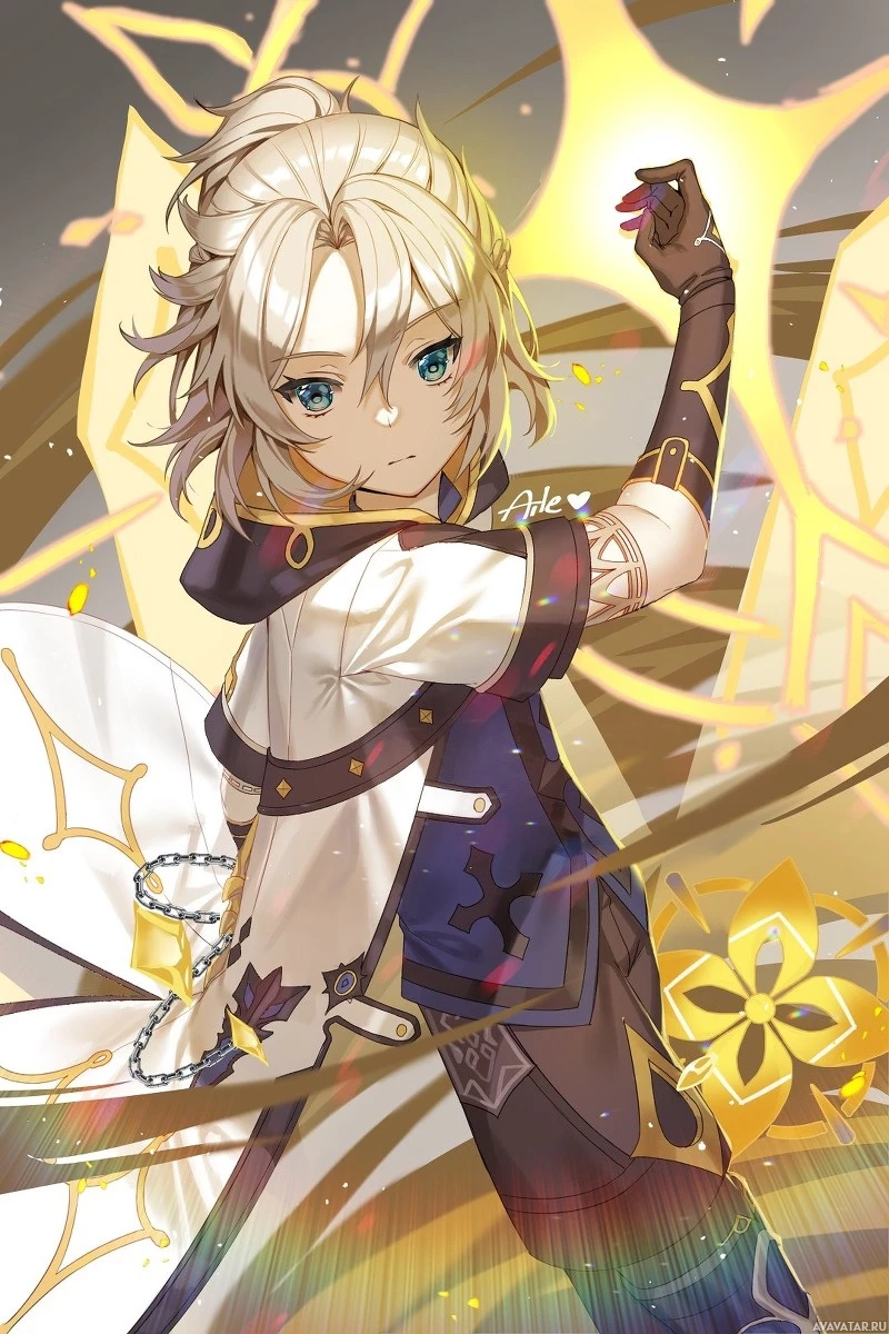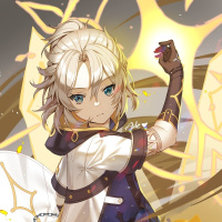 blond hair and blue eyes, dressed in an armor-like outfit. They are holding what appears to be a staff or wand in their right hand, which is raised as if casting a spell or performing some