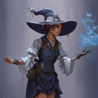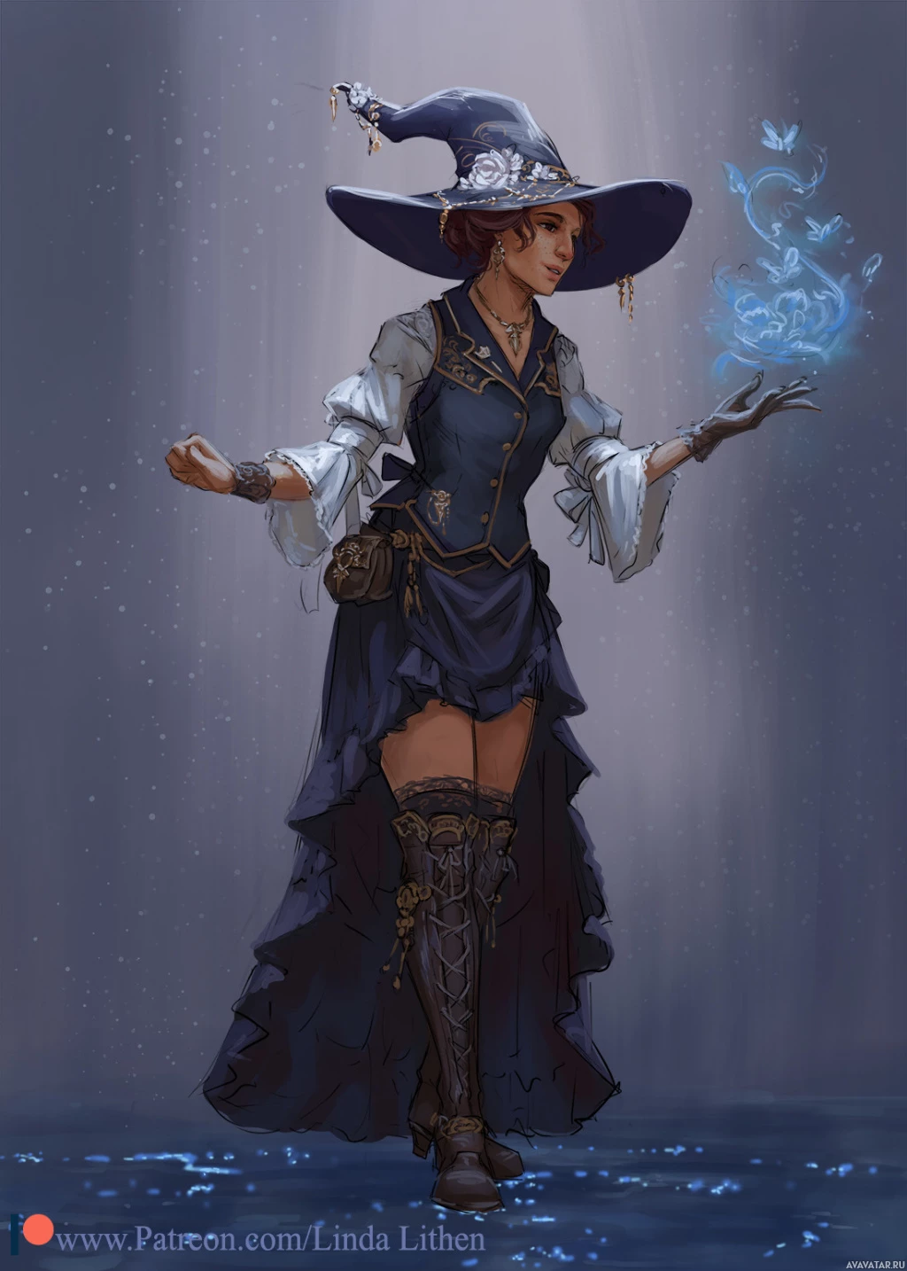 a long dress with lace details, boots, and has a large hat that could suggest she's a practitioner of the craft. In her right hand, she seems to be casting or controlling