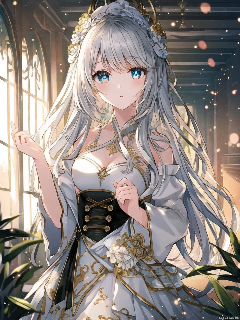 white hair, dressed in a fantasy-style dress. She appears to be a princess or royalty given