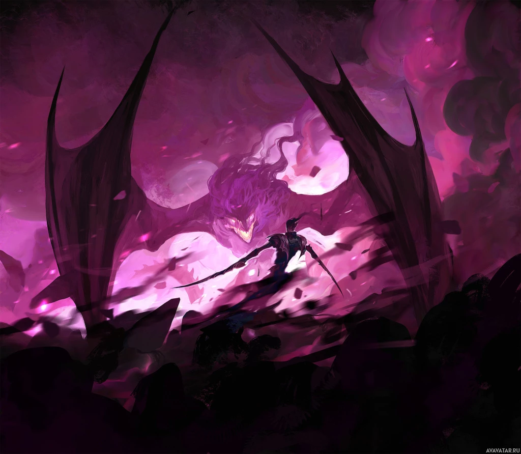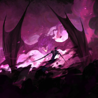 a large dragon-like creature with purple and pink hues emanating from its body, suggesting a magical or powerful presence. The background is filled with swirling clouds and possibly a storm, adding to