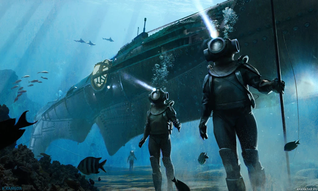 diving gear and appear to be interacting with the submarine, possibly preparing to dive or inspect it. The setting seems to be underwater, given the visibility of the water and the presence of