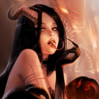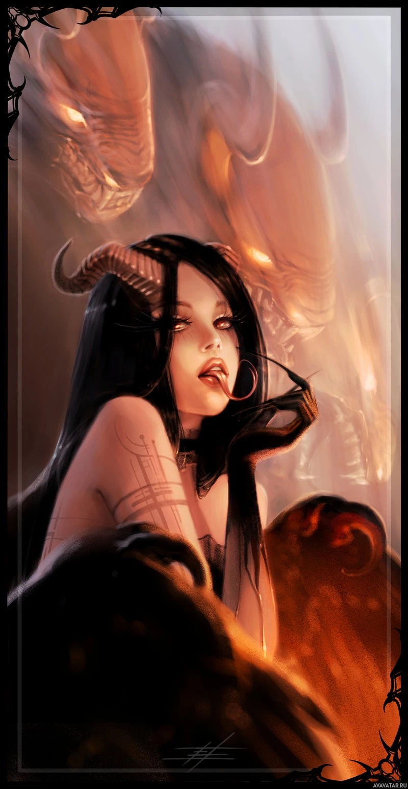 The image depicts a fantasy-themed illustration featuring a character that appears to be a succubus. She has