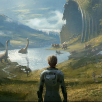 an individual standing looking out over the scene, with their back to the viewer. To the left of this figure, there appears to be a small settlement or encampment with people engaged in