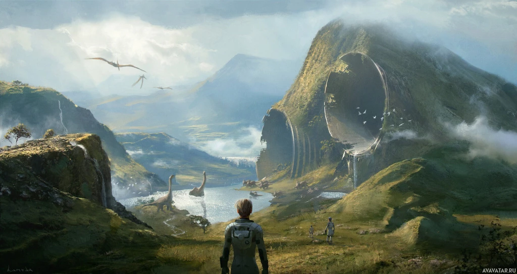 cave mouth is open and inviting, suggesting it may lead deeper into the landscape. Beyond the cave, a waterfall cascades down from the cliffs, adding to the natural beauty of the scene. The background features towering mountains, which are shrouded in mist or low-lying clouds, giving the scene an ethereal and mystical quality. The sky is overcast with cloud formations that contribute to the otherworldly atmosphere. Overhead, there's a sense of flying creatures, possibly birds, which adds to the fantastical elements of the image. The overall composition and color palette give the scene a serene yet mysterious vibe, fitting within the realm of science fiction where imaginative landscapes are commonplace.