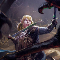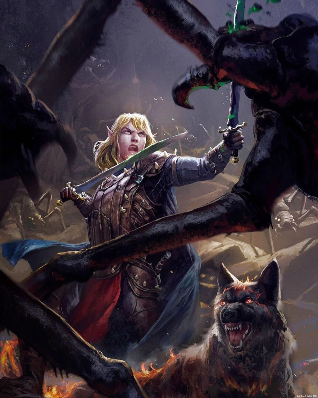 a fantasy scene with an elf character holding a sword and standing among what appears to be a group of aggressive creatures. The elf is wearing armor and a cape, suggesting a role as a warrior or defender. In the background, there's a wolf, possibly a werewolf given its human-like form and attire, which adds to the fantastical theme of the image. The setting appears to be an outdoor