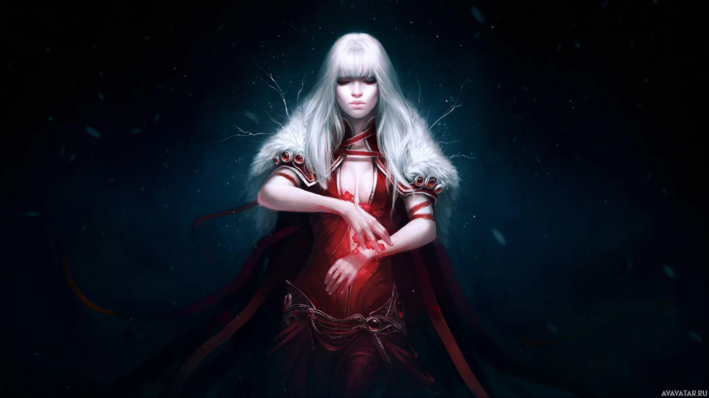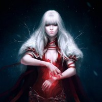white hair and one eye closed, giving her a mysterious or ethereal look. She is adorned in what seems to be a dark, fantasy-inspired garment, possibly armor or