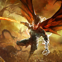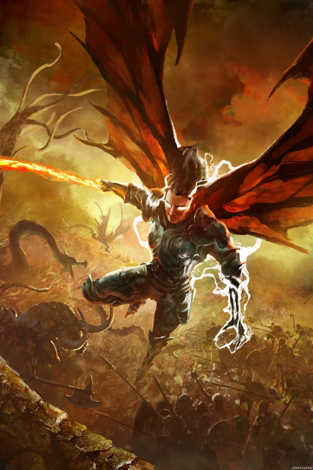 magical being, possibly a wizard or a character with mystical abilities, given their wings and the spell they are casting. They are set against a dark, chaotic background that suggests a battlefield, further emphasizing their role as a heroic or powerful figure in
