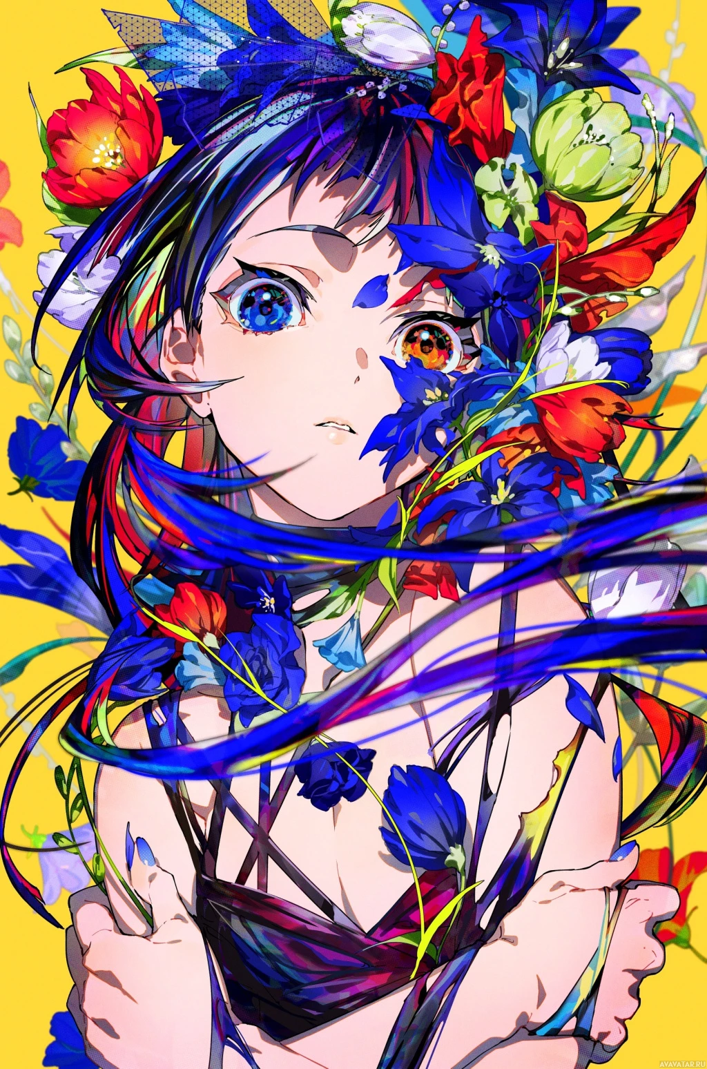 a flower crown or headband made up of various flowers in different colors such as red, orange, yellow, and green. The flowers also seem to have seeds attached to them, giving the impression that they might be floating in mid-air around her. The girl has a somewhat