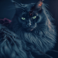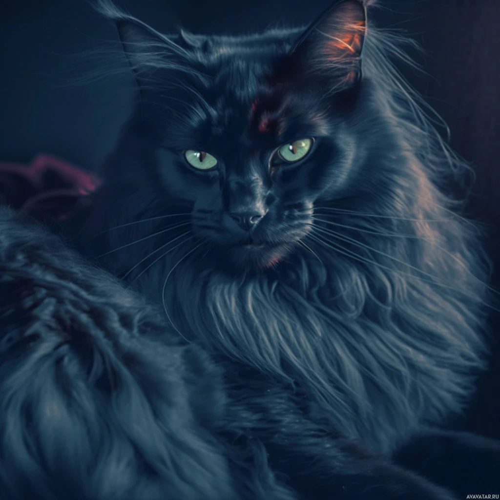 На картинке изображен черный кот с выпуклыми зелеными глазами. У кота длинная пушистая шерсть, и он удобно расположился на чем-то, напоминающем мягкую поверхность или, возможно, кровать.