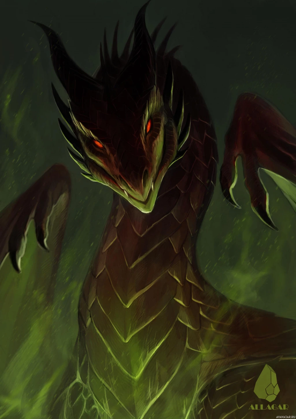 sharp teeth and horns, an intimidating expression on its face, and is surrounded by a dark, ominous atmosphere. The dragon's body has scales, and it appears to be in a menacing or aggressive posture, with claws extended as if ready for battle or defense. The art style suggests it might be from