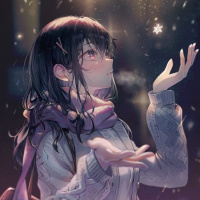 an animated character, a girl with long brown hair. She appears to be enjoying the falling snow on her hand and looks up at the sky, perhaps admiring the stars or just the simple beauty of