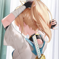blonde hair tied up into what looks like a ponytail. The character is wearing what could be a sword or weapon on her back, suggesting she might be involved in some form of combat or adventure. There's also an item that resembles a cookie near the bottom right corner of the image, which adds to the fantastical theme of the illustration.