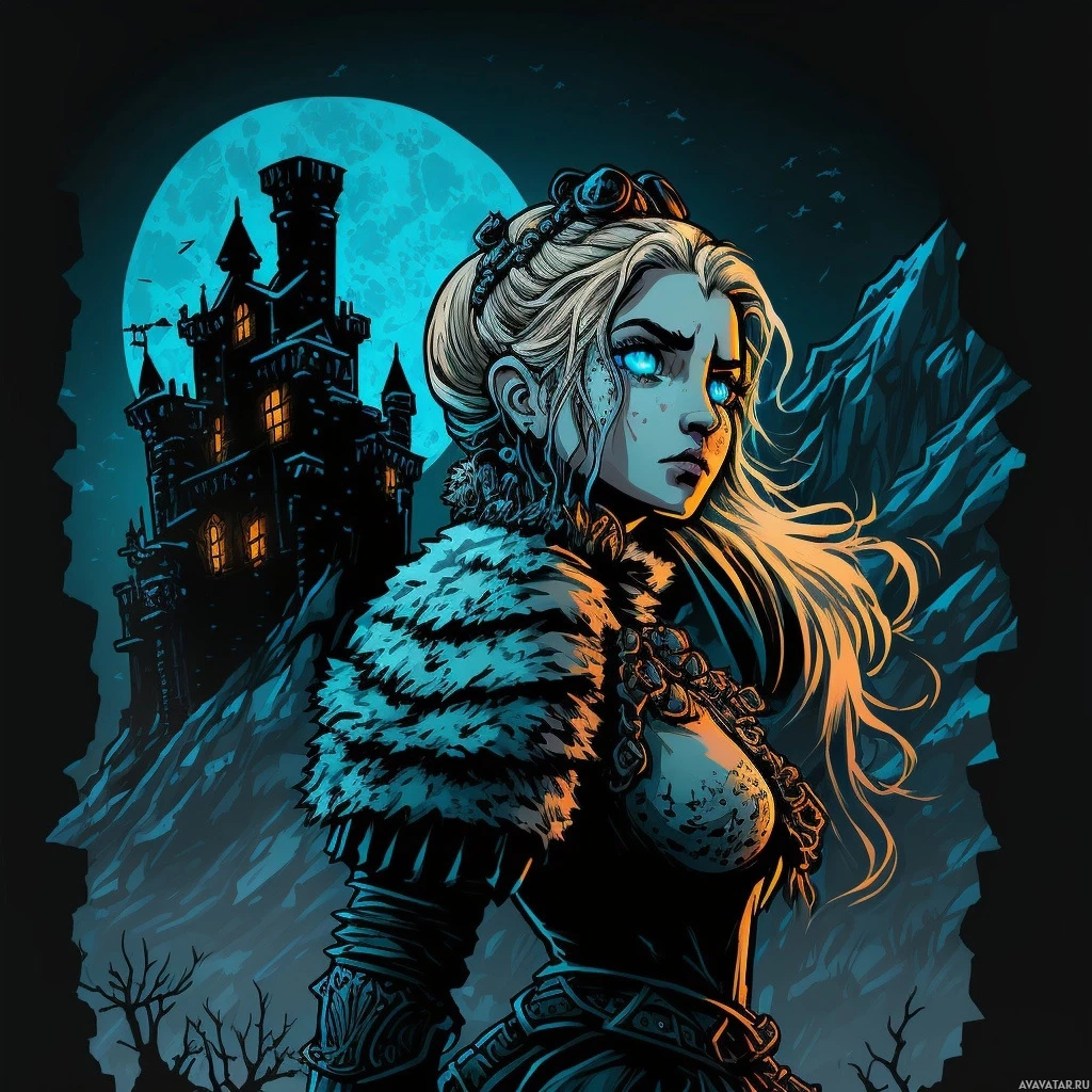a female character with blonde hair and blue eyes. She is wearing armor that resembles medieval or fantasy attire, featuring fur and leather elements. In the background, there is a castle silhouetted against