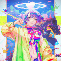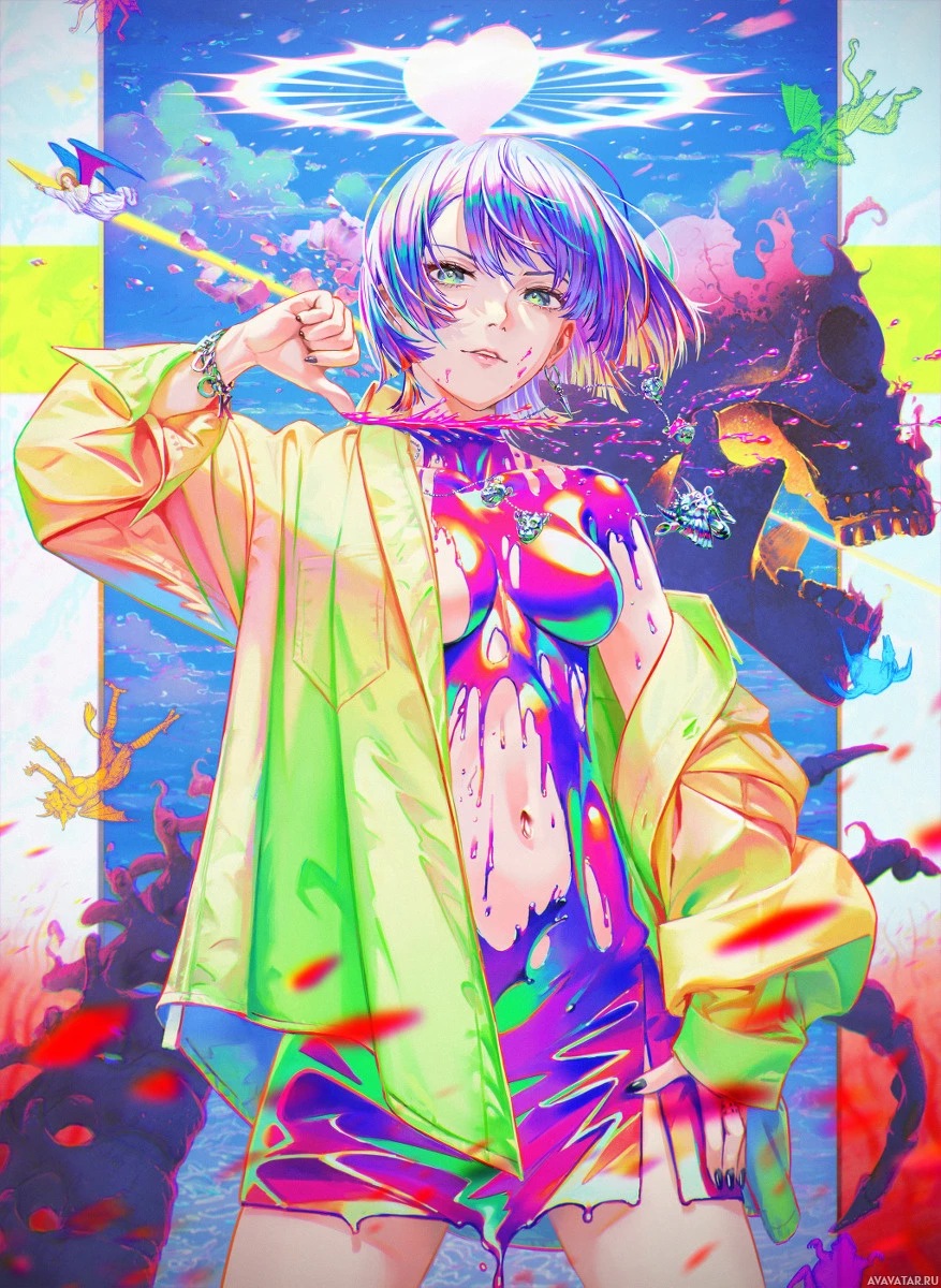 splashes of color and abstract elements, creating an energetic and dynamic atmosphere. This character could possibly be from an anime or manga series, but without more context, it's difficult to determine