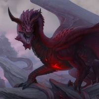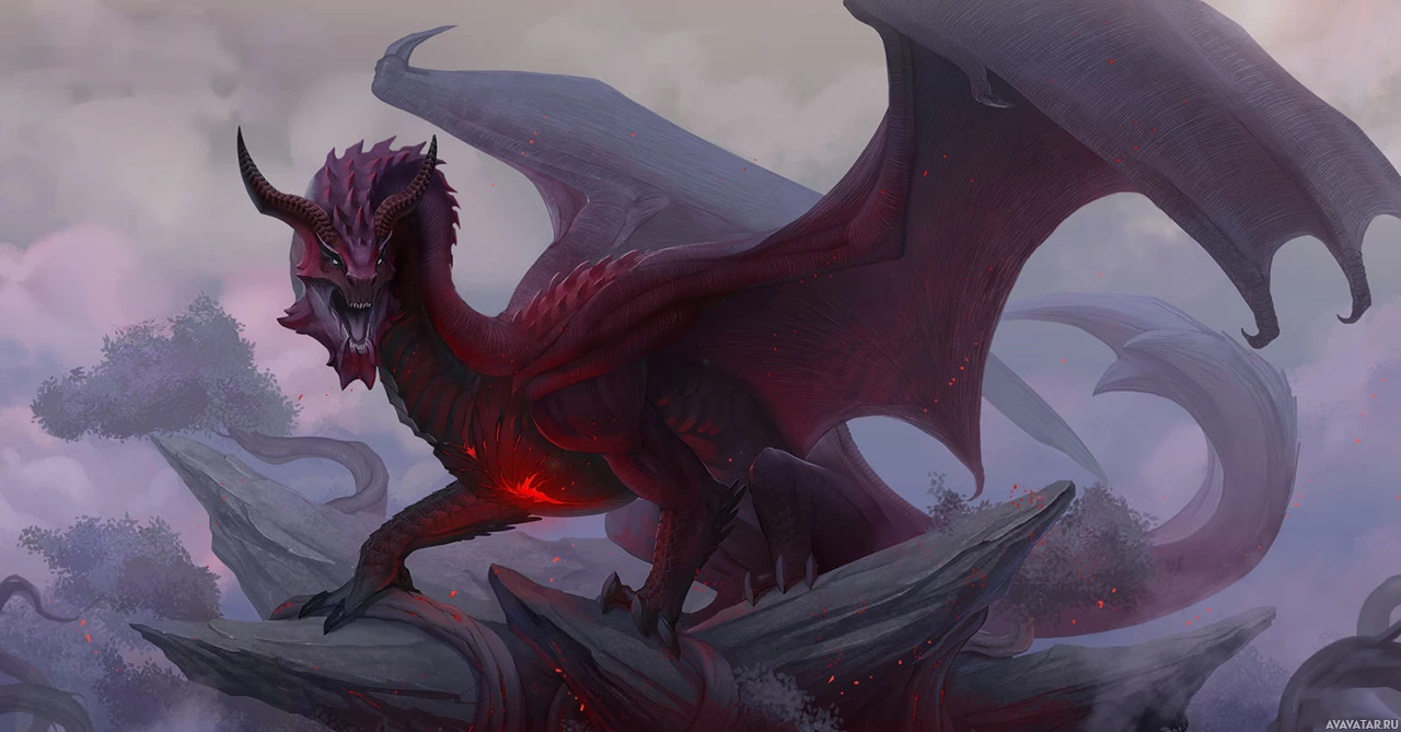 The image displays a fantasy-themed scene featuring a large, menacing red dragon with