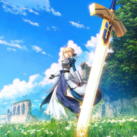 the video game "Genshin Impact." She is holding a sword and standing in a field with flowering grass. In the background, there's an ancient-