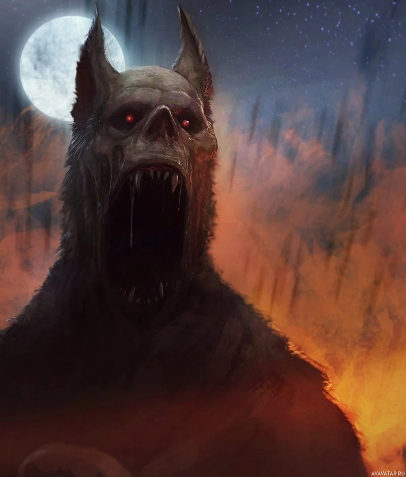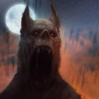 the body structure and features of a typical wolf, but also includes human-like traits such as arms and hands with claws. The creature is set against a dramatic backdrop that includes