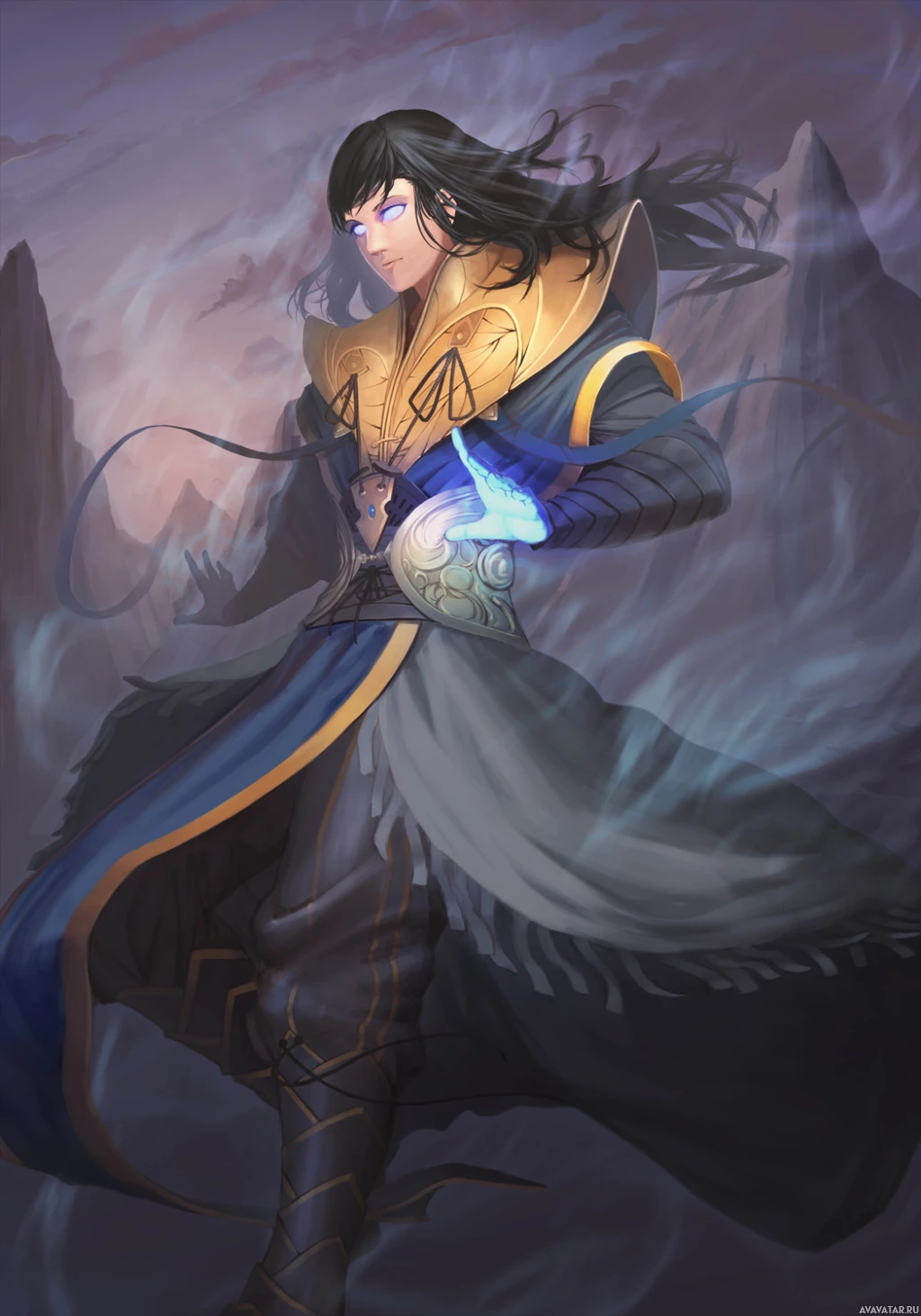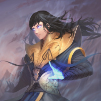 dark hair and is wearing armor with various ornaments and accessories that suggest a medieval or fantasy setting. There are also elements of magic around her hand, indicating she might possess