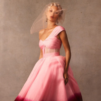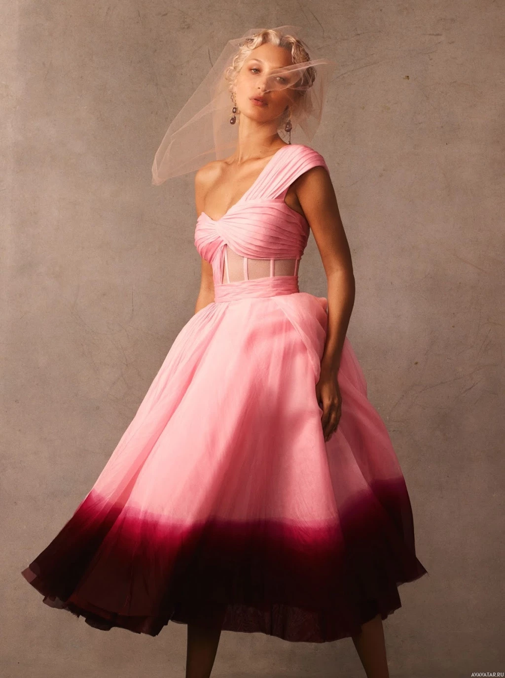 blonde hair and is wearing a pink strapless dress with a vibrant red dye that fades towards the bottom, creating a gradient effect. Additionally, she has a veil placed on her head. Her pose suggests confidence and elegance. The style of the image is consistent with fashion photography, aiming to showcase the clothing in