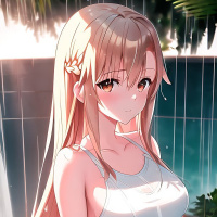 The image features an animated character, a girl with long blonde hair and pink eyes. She is wearing a white swimsuit and standing in a pool, surrounded by palm trees which suggests a tropical or resort setting. The art style is consistent with anime aesthetics.