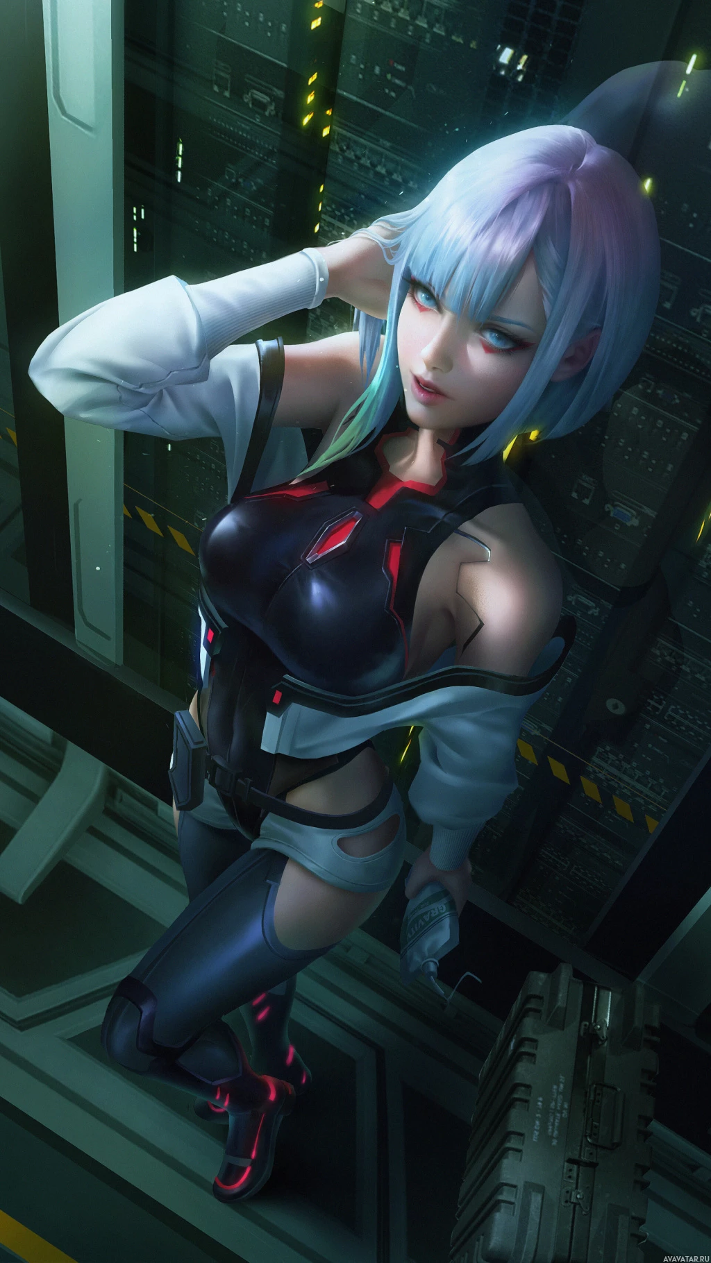 a cyberpunk setting. The image captures her confident demeanor as she holds one hand on her hip and the other resting on her head, possibly indicating