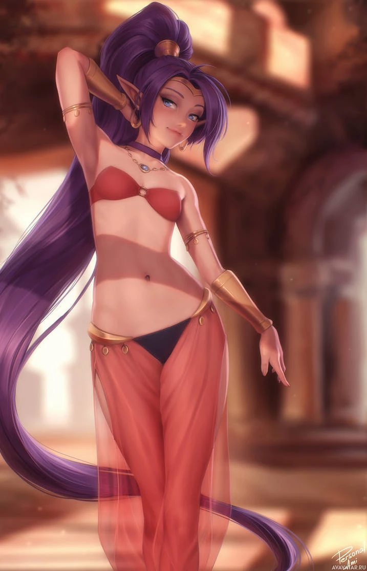 purple hair and is wearing a bikini, with one hand resting on her hip in a pose that suggests confidence or relaxation. The character is styled to look like a human female, but with fantasy-inspired elements such as
