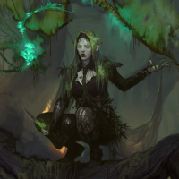 an elf character. The elf is shown standing in the center of a dark, swampy