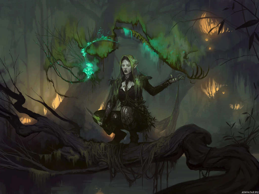 the mystical atmosphere of the scene. The background is filled with dark trees and a misty environment that adds to