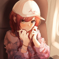 a plaid top and has her hand on her chin, suggesting a thoughtful or contemplative expression. The background suggests she might be in an airplane cabin or a similar