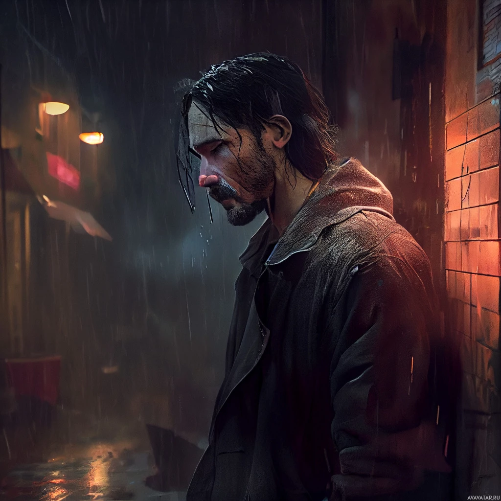 The image depicts a person standing in the rain with their eyes closed, leaning against a wall. They appear to be in a contemplative or possibly distressed state, given