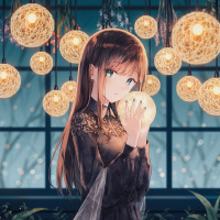 a whimsical atmosphere, possibly in a garden or an outdoor space at night due to the presence of lights and lanterns. The artwork has a magical or fantastical theme, which is common in anime and manga illustrations.