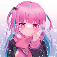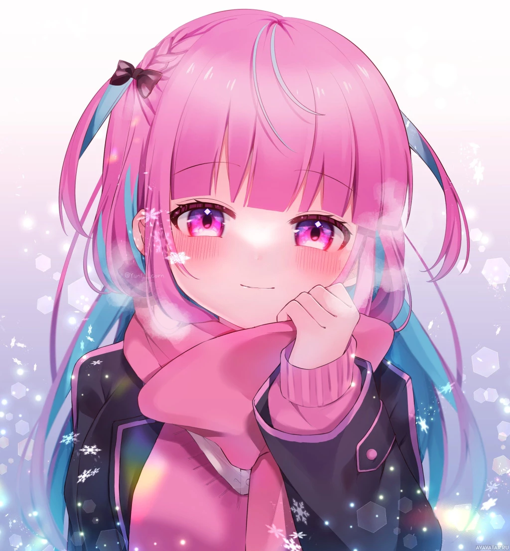 a black jacket and a pink scarf around her neck. Her expression is cheerful as she seems to be enjoying