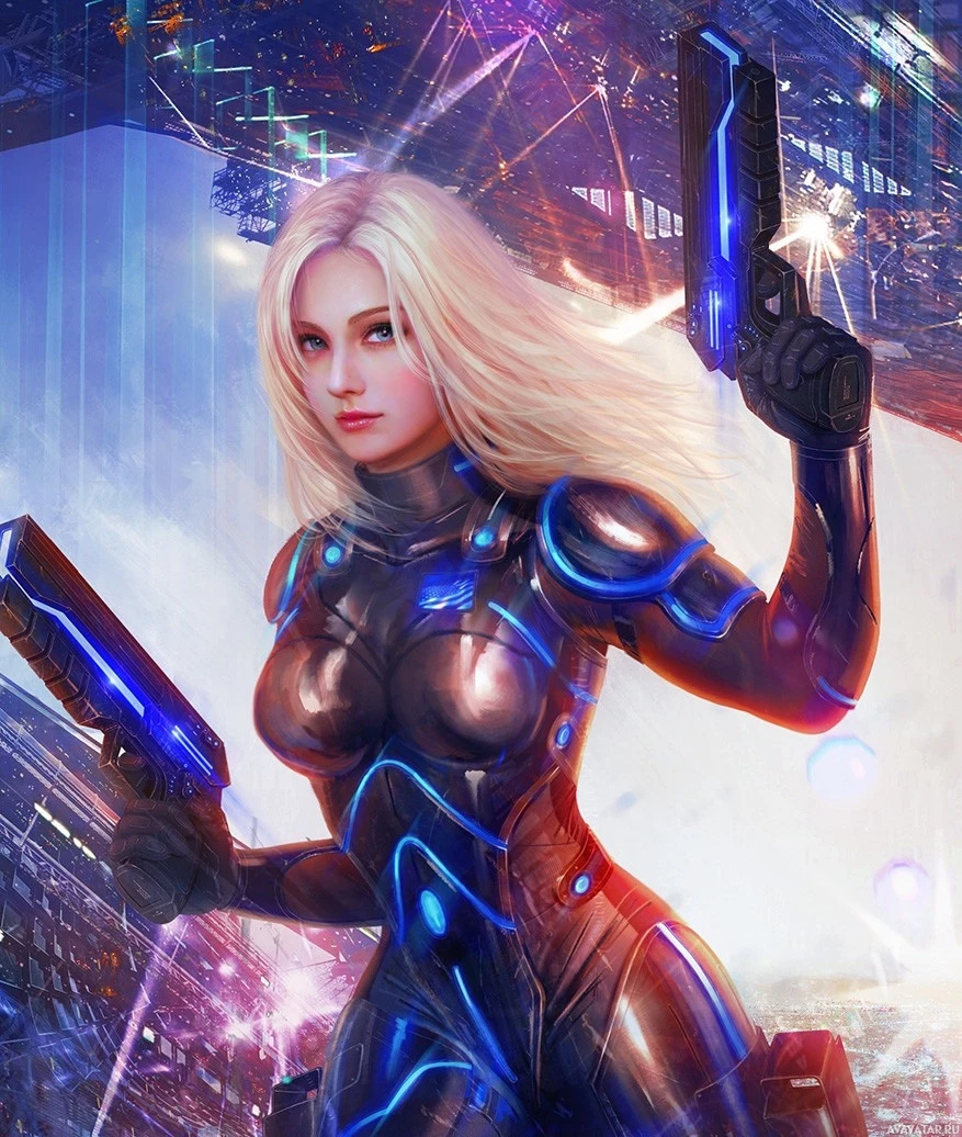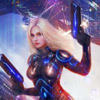 blonde hair and is wearing an armor-like suit with blue accents that could suggest a high-tech design. In her hands, she's holding what appears to be