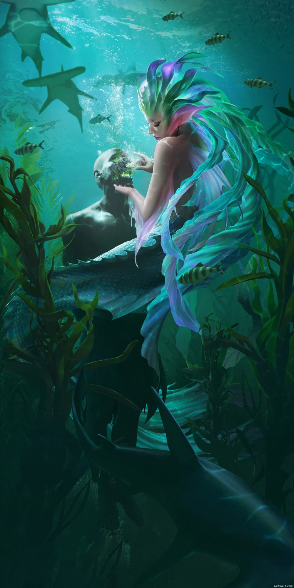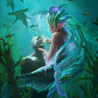 a fantasy scene featuring a mermaid. The mermaid is shown with