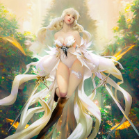 a forest setting, which includes trees, flowers, and light rays emanating from her hand, enhancing the mystical atmosphere of the scene.