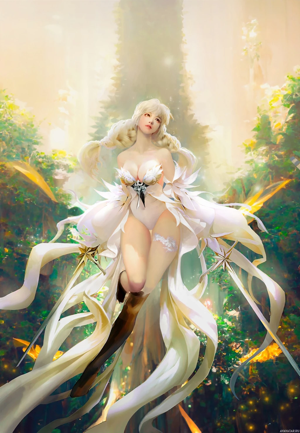 white hair and a sword. She is wearing an ethereal outfit that seems to be magical or fantasy-inspired in nature, possibly resembling fairy wings or some kind of
