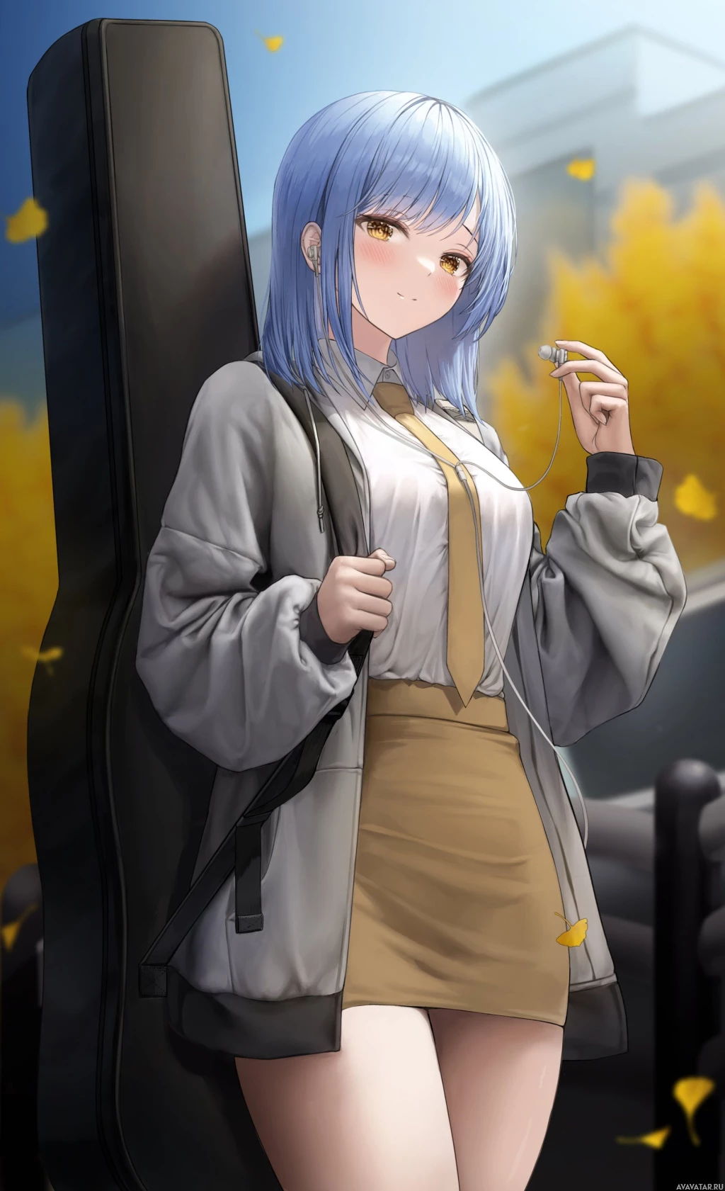 a guitar case, suggesting she might be a musician or enthusiast of the instrument. There are leaves falling around her, indicating it could be