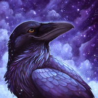 a night sky filled with stars, which creates a mystical or cosmic atmosphere around the crow. The color palette consists mainly of blues and purples, enhancing the nocturnal and ethereal feel of the artwork.