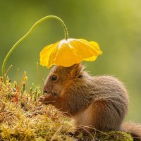 The image shows a small squirrel perched on what appears to be a mossy patch of ground. The squirrel has its tail wrapped around a yellow flower, possibly for warmth or comfort. In the background, there's a green plant and a clear blue sky with some clouds. This scene captures an adorable interaction between wildlife and nature elements.