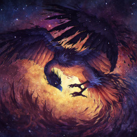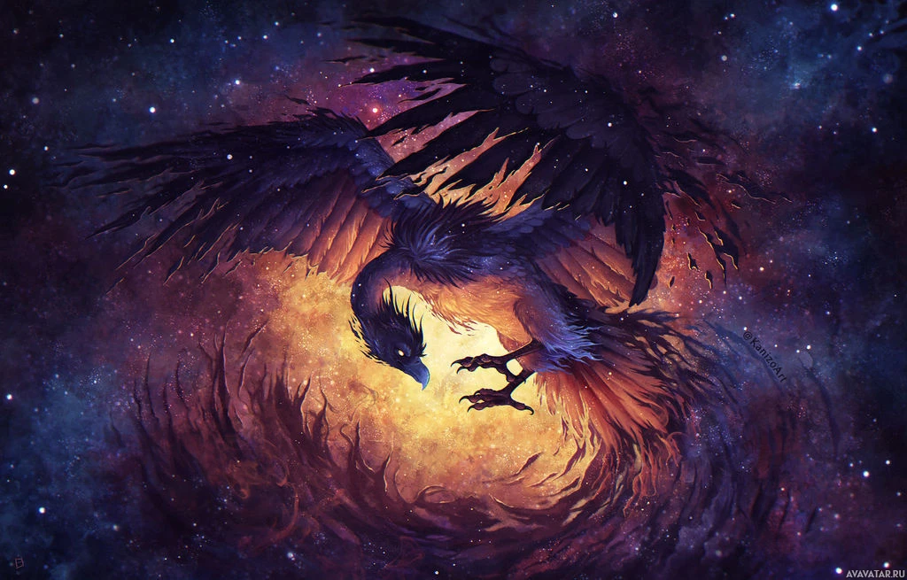 Это изображение фантастического существа, напоминающего феникса. Оно изображено с распростертыми крыльями, охваченное пламенем в центре. На заднем плане изображено космическое и огненное небо, что придает ему мифический и мистический вид.