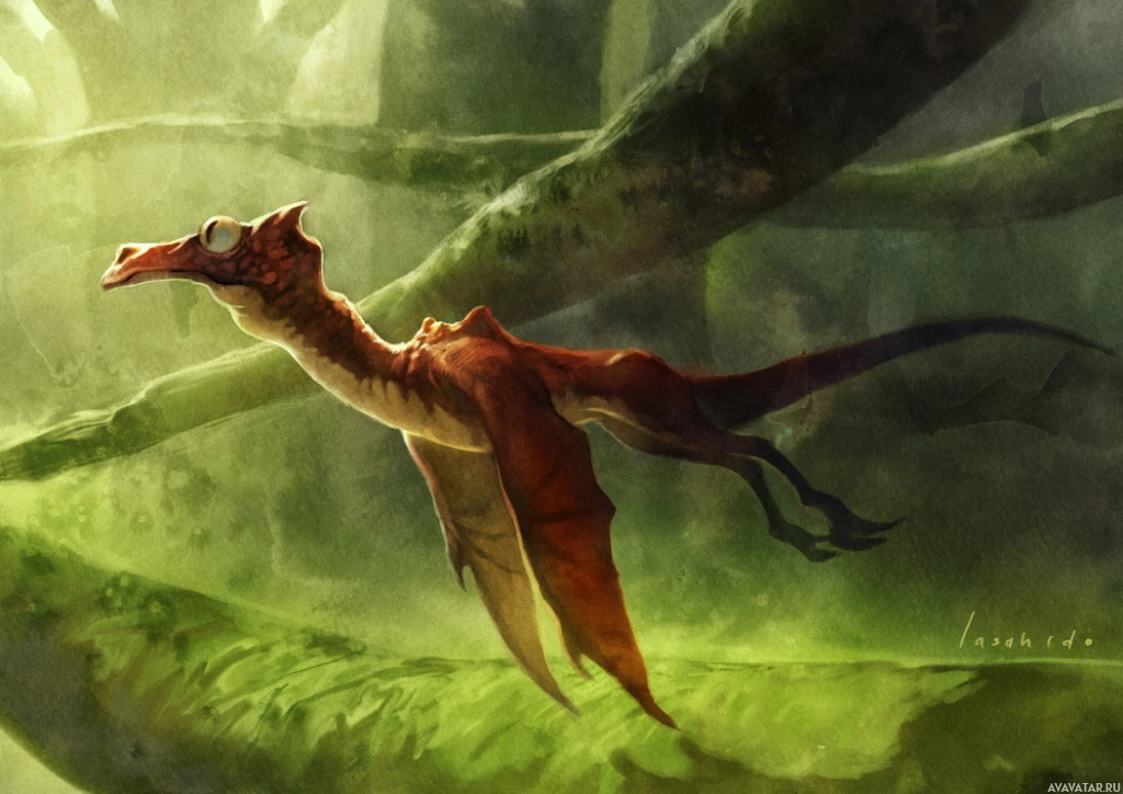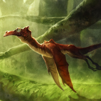 traditional depictions of dragons, suggesting a unique or mythical variant of the creature. The background consists of lush greenery with trees and foliage, enhancing