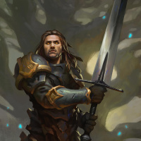a natural setting, possibly an outdoor area with trees around him. The character is depicted wearing armor and carrying the sword with both hands, ready for combat or adventure. The art style suggests this could be a piece of concept art for