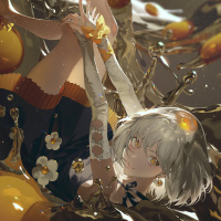 white hair, lying on her stomach among a bunch of fruit. There are orange and yellow pieces scattered around her body, suggesting she might have been playing or handling the fruit carelessly. Her hands are intertwined behind her head in