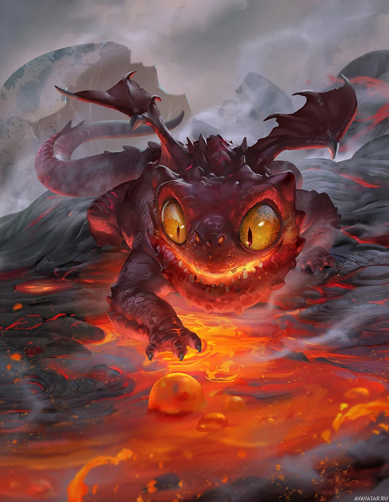 fiery eyes and a somewhat mischievous expression as it reaches out towards what looks like a magical orb on the ground. The background suggests a volcanic environment with molten rock flowing around, which is typical of