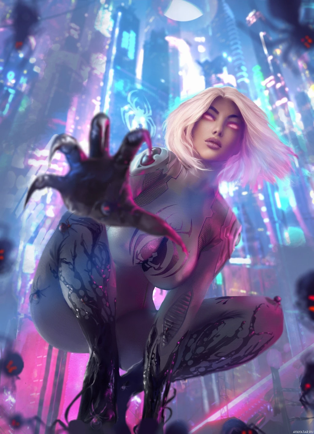 prosthetic limbs. The background is vibrant with neon colors, suggesting